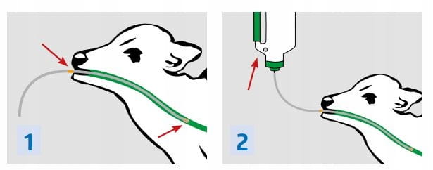 - Wprowadź rurkę wraz z elastycznym wężem do przełyku cielęcia, upewniając się, że nie trafia do tchawicy.