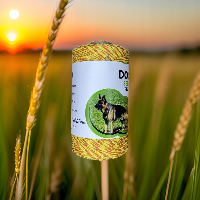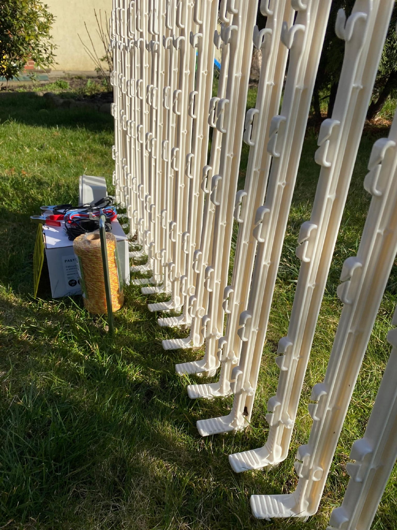 2️⃣ Rozwijamy PLECIONKĘ i wieszamy ją na słupkach na co najmniej 2 wysokościach, które zależą od wielkości zwierzęcia. Ważne jest, aby plecionka nie miała kontaktu z roślinnością taką jak krzaki, trawa.