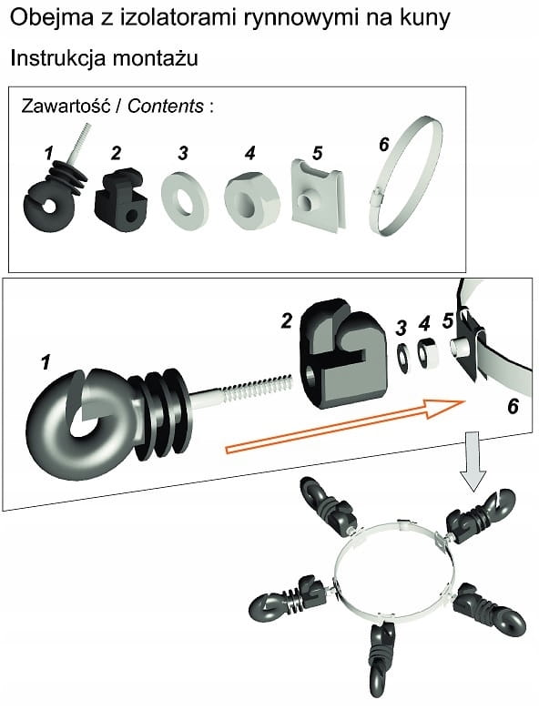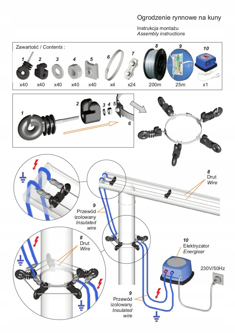 Najskuteczniejszy sposób na zabezpieczenie domu przed wtargnięciem kun. Bariera elektryczna do montażu na rynnach i rurach odprowadzających przeciw kunom w domach. Urządzenie zabezpiecza budynek przed wspinaniem się kun na dach i dostawaniem się kuna na dach w celu założenia gniazda. Kuny dotykając linii zamykają obwód elektryczny i otrzymują impuls bardzo wysokiego napięcia. Kuna po kontakcie z elektrycznym ogrodzeniem rynnowym nabiera obaw przed próbą kolejnego wejścia, a zwykle całkowicie rezygnuje z kolejnej próby.