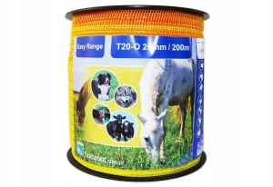 Taśma do budowy elektrycznych ogrodzeń. Kolor żółto-pomarańczowy, bardzo dobrze widoczny dla zwierząt.